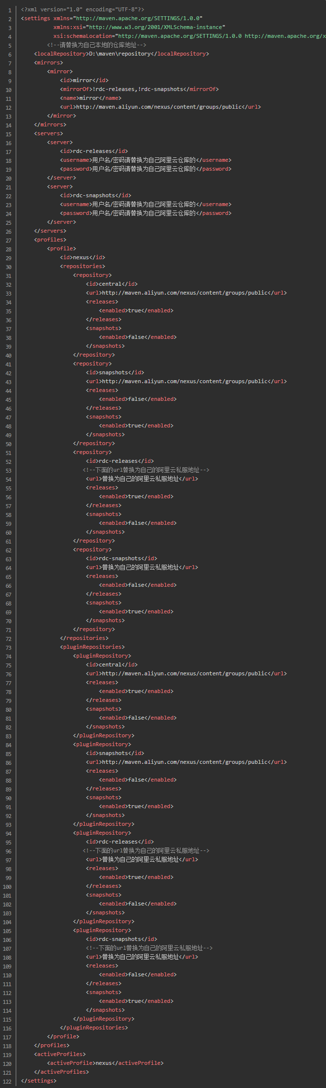 5、配置Maven私服地址和本地仓库路径,请按下面的注释进行替换为自己的私有仓库信息。