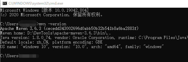 运行 -> cmd命令窗口,在命令行中输入:mvn -version ,如下图所示,展示版本信息说明安装配置成功。