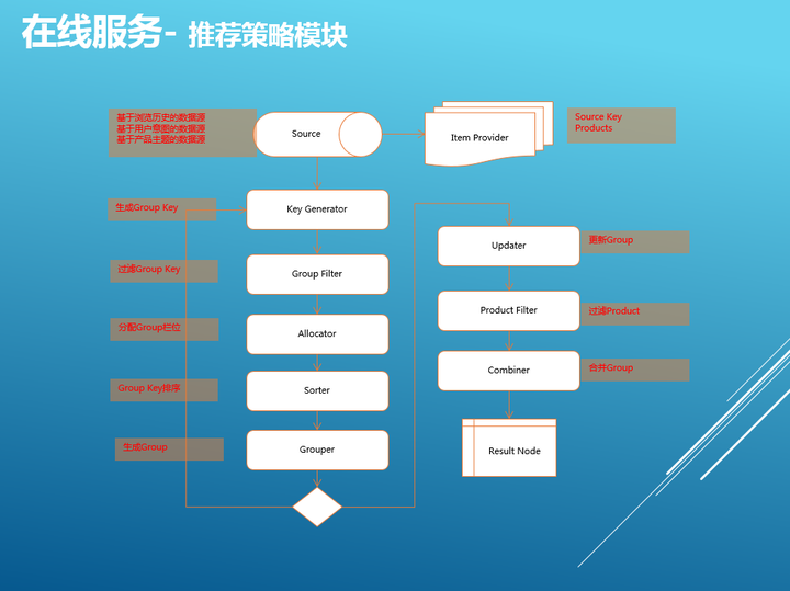 2、业务层架构-推荐策略模块,整个流程是先将用户意图、用户浏览,相关推荐策略生成的产品集合等做为数据输入,接着按照场景规则,业务逻辑重新过滤,聚合、排序。最后验证和拼装业务线产品信息后输出推荐结果;