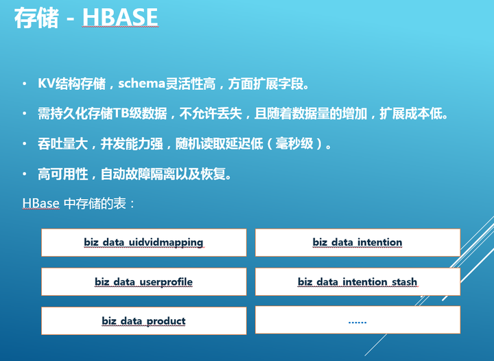 我们现状是需要安全存储海量的数据,高吞吐,并发能力强,同时随着数据量和请求量的快速增加,能够通过加节点来扩容。另外还需要支持故障转移,自动恢复,无需额外的运维成本。综上几个主要因素,我们进行了大量的调研和测试,最终我们选用Hbase和Redis 两个Nosql数据库来取代以往使用的Mysql,。我们把用户意图以及推荐产品数据以KV的形式存储在Hbase中,我对操作Hbase进行一些优化,其中包括rowkey的设计,预分配,数据压缩等, 同时针对我们的使用场景对Hbase本身配置方面的也进行了调优。目前存储的数据量已经达到TB级别,支持每天千万次请求,同时保证99%在50毫秒内返回 。