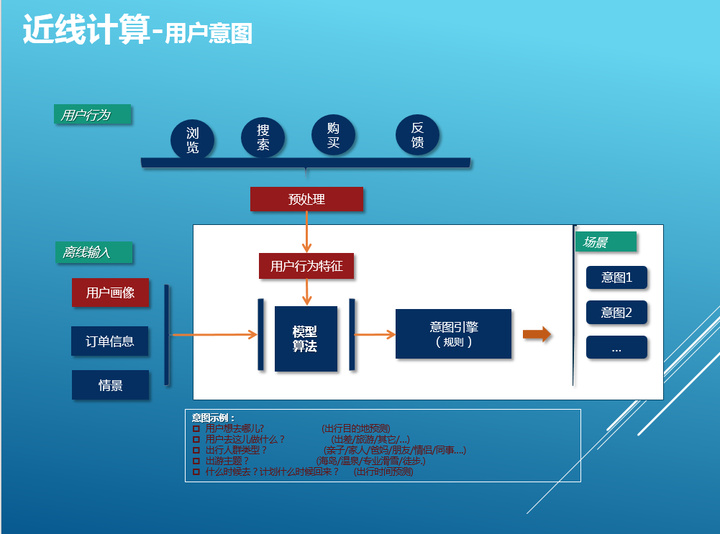 一般来说用户特征分成两大类:一种是稳定的特征(用户画像),如用户性别,常住地,主题偏好等特征;另一类是根据用户行为计算获取的特征,如用户对酒店星级的偏好,目的地偏好,跟团游/自由行偏好等。基于前面所述的计算的特点,我们使用近在线计算来获取第二类用户特征,整体框图如下。从图中可以看出它的输入数据源包括两大类:第一类是实时的用户行为,第二类是用户画像,历史交易以及情景等离线模块提供的数据。结合这两类数据,经一些列复杂的近线学习算法和规则引擎,计算得出用户当前实时意图列表存储到Hbase和Redis中。
