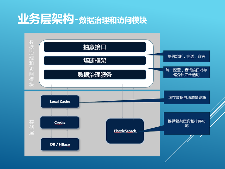 1、业务层架构-数据治理和访问模块,支持的存储介质,目前支持的存储介质有Localcache,Redis,Hbase,Mysql 可以支持横向扩展 。统一配置,对同一份数据,采用统一配置,可以随意存储在任意介质,根据id查询返回统一格式的数据,对查询接口完全透明。