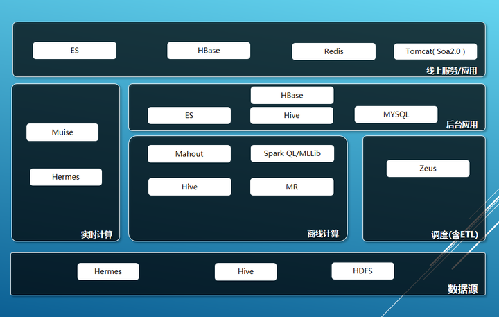 这里说明一下, 在线和后台应用使用的ElasticSearch和Hbase集群是分开的,互不影响。 Redis 支持在线服务的高速缓存,用于缓存统计分析出来的热点数据。