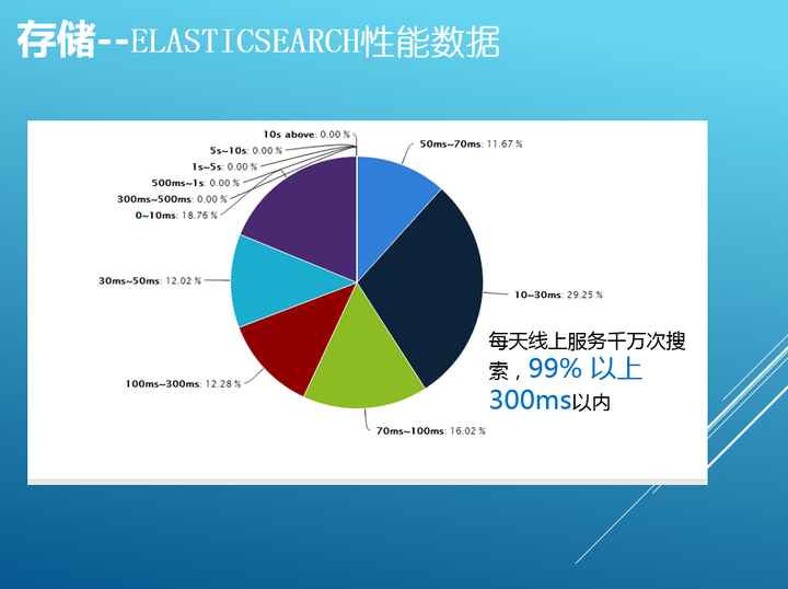 ES索引各业务线产品特征数据,提供基于用户的意图特征和产品特征复杂的多维检索和排序功能,当前集群由4台大内存物理机器构成,采用全内存索引。对比某一个复杂的查询场景, 之前用Mysql将近需要30次查询,使用ES只需要一次组合查询且在100毫秒内返回 。目前每天千万次搜索,99%以上在300毫秒以内返回。