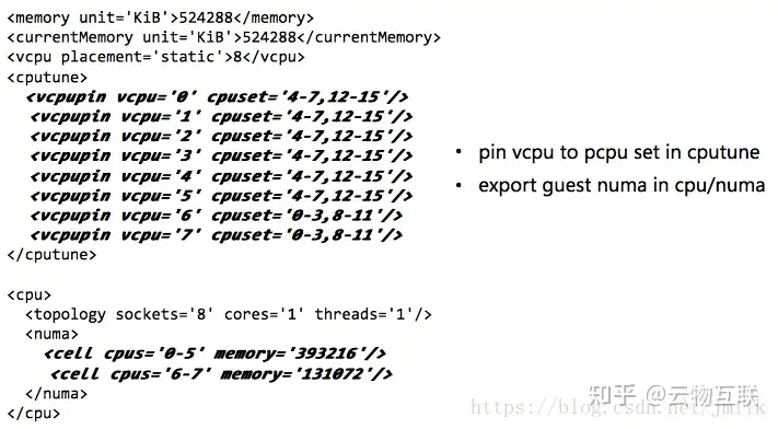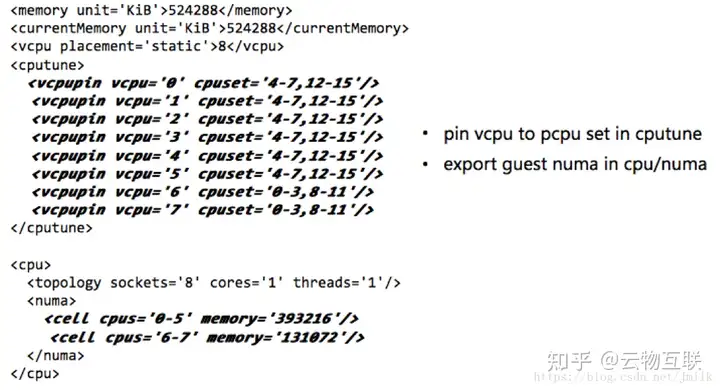 NUMA 亲和:将虚拟机绑定 NUMA Node,guest vCPUs/RAM 都分配在同一个 NUMA node 上,充分使用 NUMA node local memory,避免访问 remote memory 的性能开销。