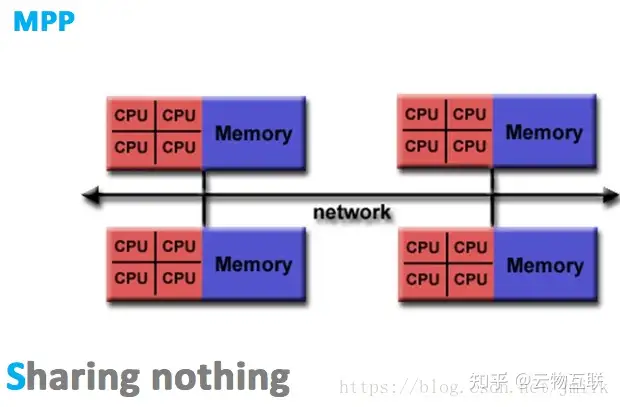 MPP 结构的特征就是「多 SMP 单元组成,单元之间完全无共享」。除此之外,MPP 结构还具有以下特征: