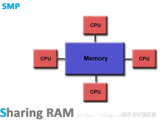 SMP(Sysmmetric Multi-Processor System,对称多处理器系统),顾名思义,SMP 架构由多个具有对称关系的处理器组成。所谓对称,即处理器之间是水平的镜像关系,无有主从之分。SMP 架构使得一台计算机不再由单个 CPU 组成;