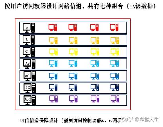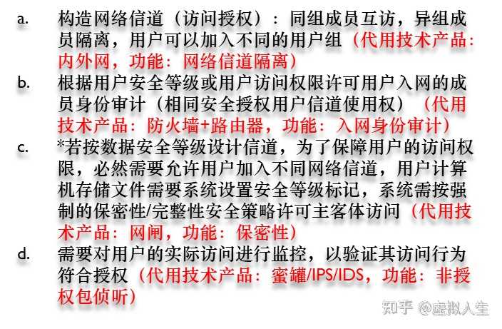 强制(第三方)访问控制的仅仅4项功能,如果没有采用VLAN标记信道网络,只能采用每个系统物理网络(保护等级越低,企业投资越多)