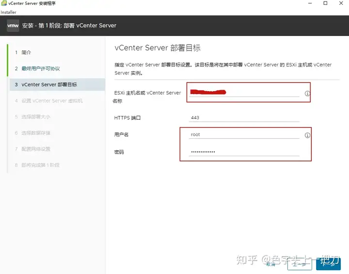 第八步:输入部署vCenter的虚拟机名称,root用户的密码。
