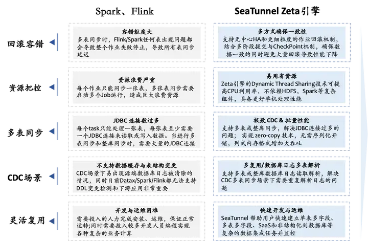 特别的,我们 Flink CDC,SeaTunnel Zeta 引擎的优势对比如下:
