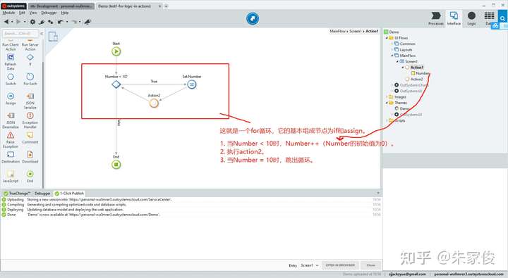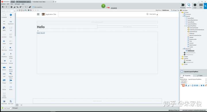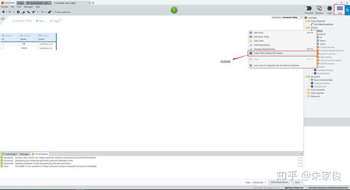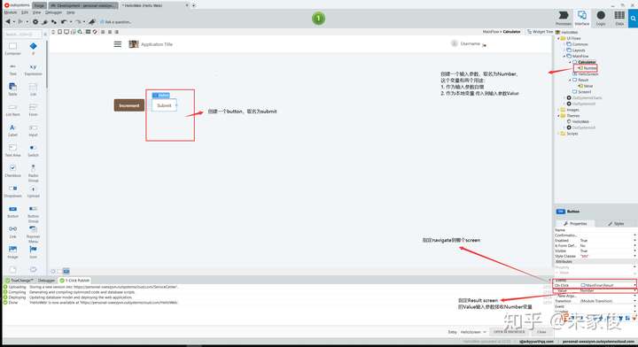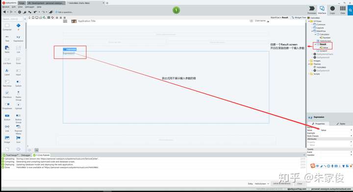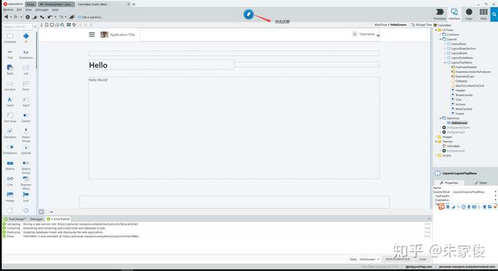 当你修改完你创建的screen之后(在本教程中我加了Hello、Hello World到screen中),点击那个被绿色包围的大大的“1”,那么你的应用就会被Service Studio上传到outsystems的platform server。接着platform server会编译、部署代码