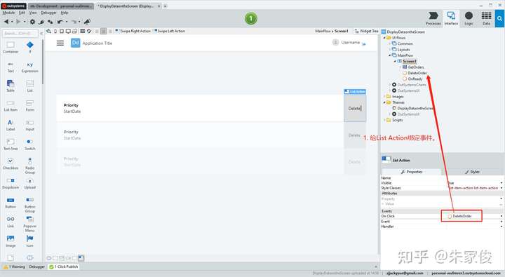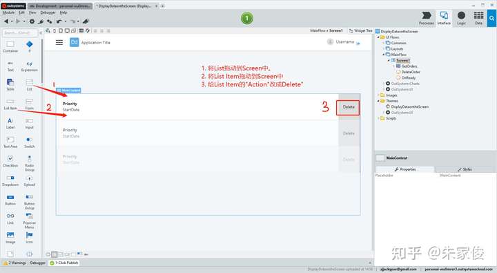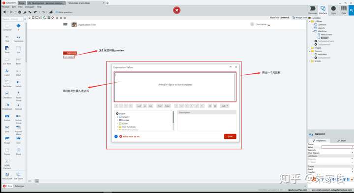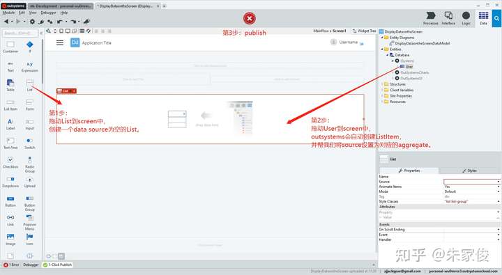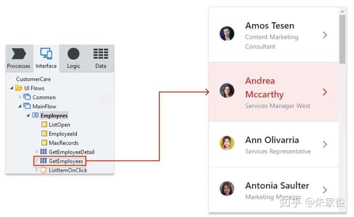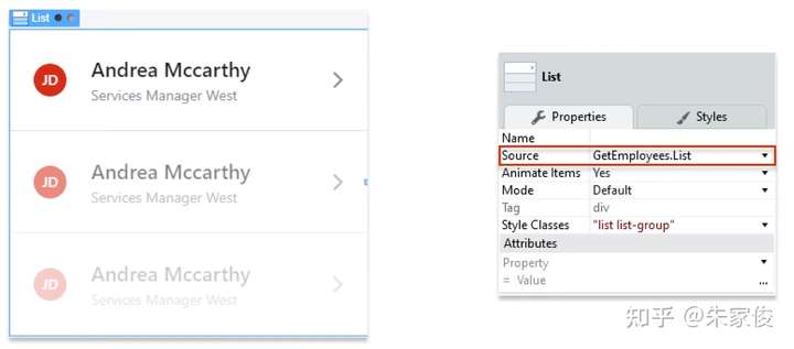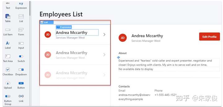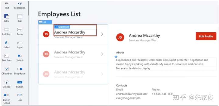 在这里,我们可以直接使用Aggregate或Data Action返回的结果。在这个例子中,我们使用员工Aggregate的返回的List。为了展示表中具体的字段,比如员工的名字。我们可以使用Expressions。