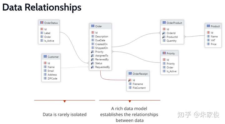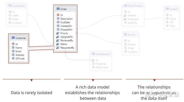 在这之中有几个entities。其中有Customer Entity,Customer Entity中有几个字段比如Name, Email, Address作为它的attributes。Order Entity的Description, Due Date, date of shipping作为Order Entity的attributes。除了这些普通独立的attributes定义每个entity,还有引用ID属性(Reference Identifier)同样定义entity。我们知道customer可以下单多个orders,而一个order对应只有一个customer。在上面这个框起来的data model中,我们有两个entities:Customer和Order,以及它们的relationship。对于customer的信息,定义在Order entity的其中一个attribute——RequestedBy中。