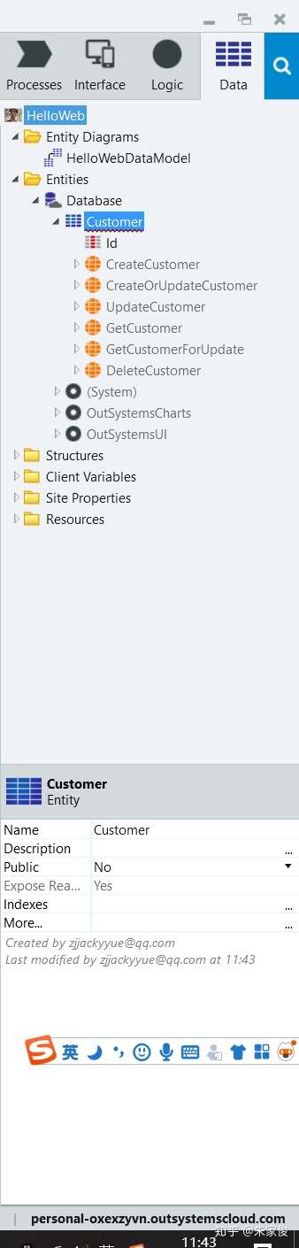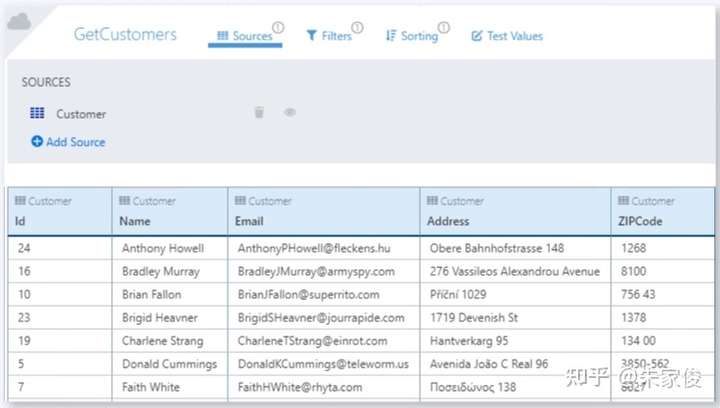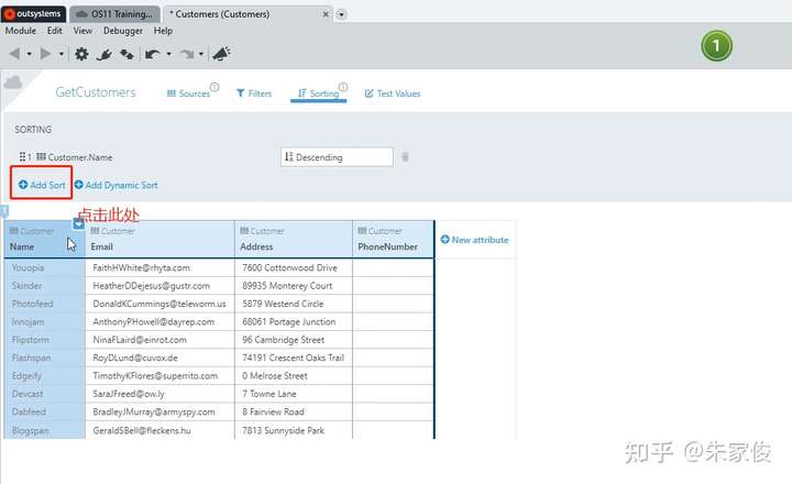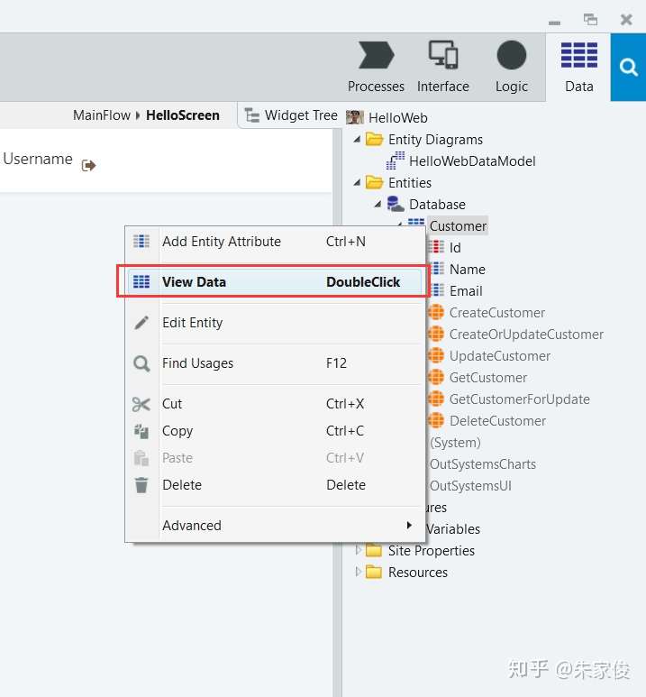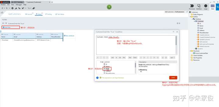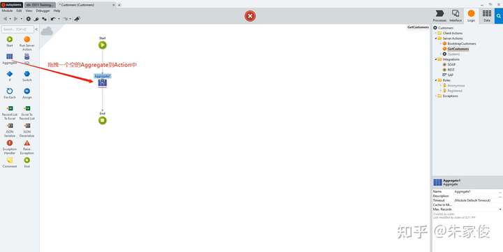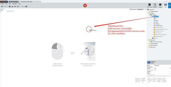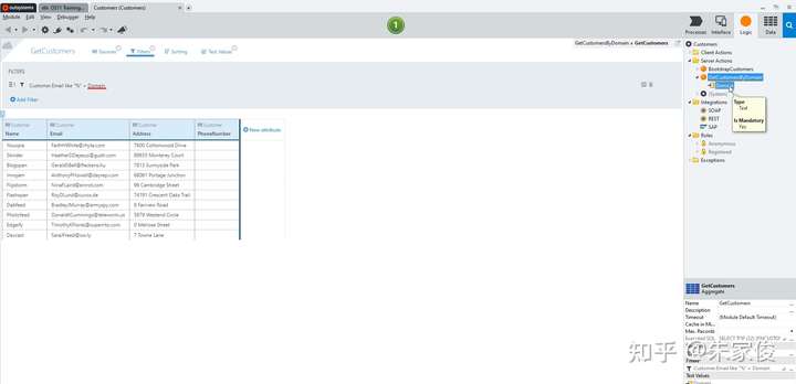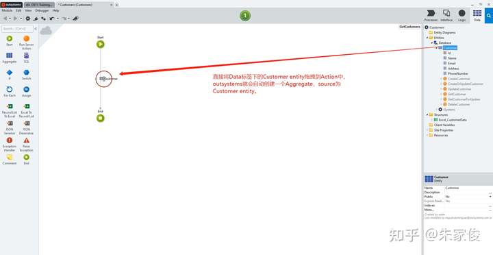 在这个DEMO中,我们将会向你展示如何在outsystems中创建一个Aggregate,用于获取data从database。在这个module中,我们已经定义了Customer entity,它已经包含了一些数据。让我们切换到Logic标签然后在GetCustomer Server Action中创建一个Aggregate