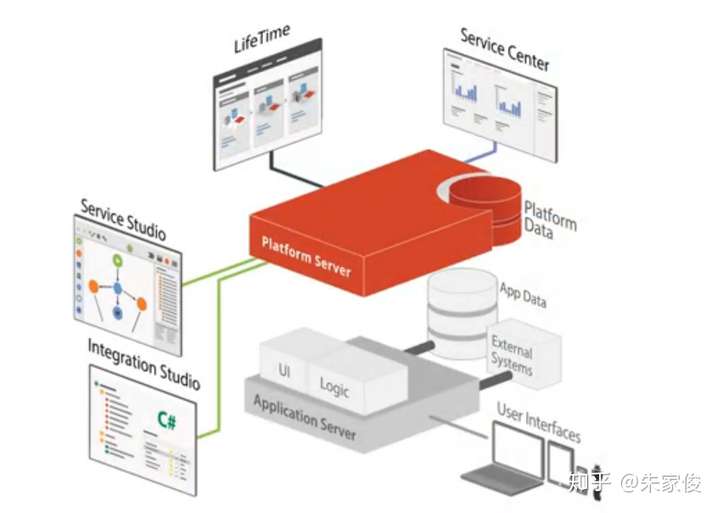 Server Studio是安装在开发者的电脑上的,该应用程序用于连接Platform Server,同时也是outsystems开发环境。一旦连接上了Platform Server,开发者可以创建和发布应用到Platform Server。每个版本的应用将会被存储在Platform Data数据库。Platfrom Server会编译生成那些应用的代码,然后部署它们到标注Application Server上。