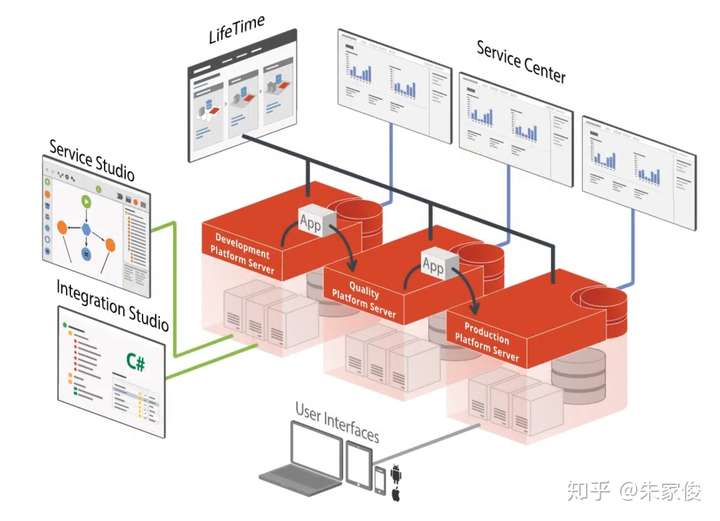 让我们看看典型的企业,我们将会有一个开发服务器和一个生产服务器。所有这些工具(LifeTime、Service Center、Server Studio、Integration Studio)可以连接各自的服务器(infrastructure)。LifeTime可以管理所有服务器的生命周期,不管你有多少服务器。