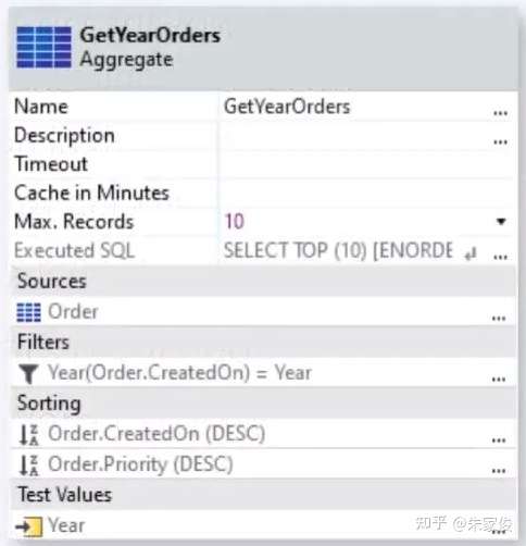 在Max.Records中可以限制Aggregate返回的最大数量records。注意这个records的最大值属性不影响我们之前看到的Count output parameter,底层的sql查询被改变查询数量的records数量的多少。我们同样有执行sql的read-only property,它允许我们查看这个Aggregate生成的sql。生成的sql是database特定的,它由outsysmtes负责生成(take care)。