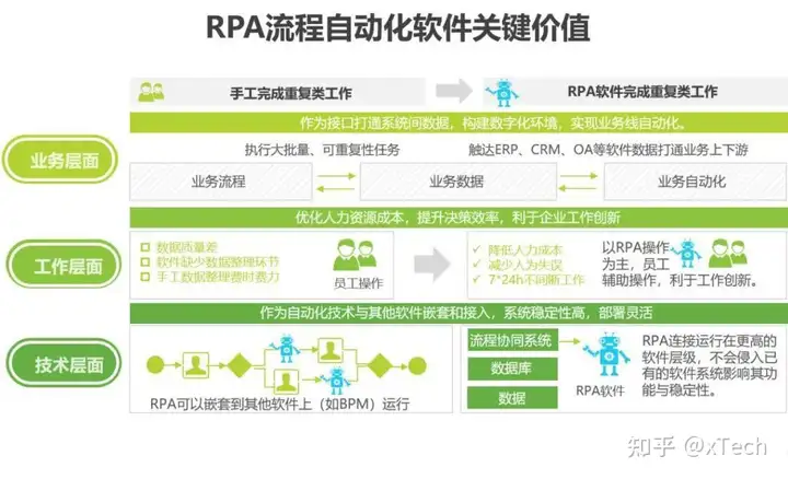 相对传统手工完成重复类工作,RPA流程自动化软件具有以下三方面价值。从业务层面来看,RPA致力于将繁琐、重复的流程实现自动化操作,并通过触达不同软件数据打通企业上下游业务,实现整条业务线自动化。
