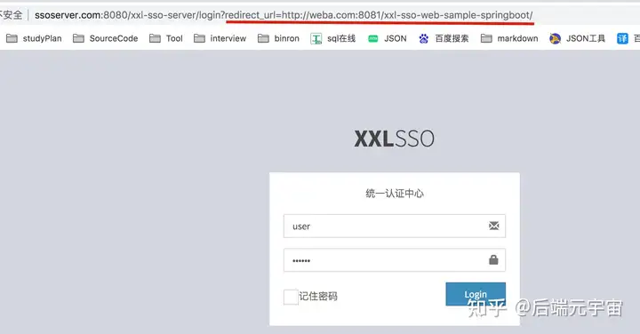 ## 1、SSO认证中心地址:http://ssoserver.com:8080/xxl-sso-server## 2、Client01应用地址:http://weba.com:8081/xxl-sso-web-sample-springboot/## 3、Client02应用地址:http://webb.com:8082/xxl-sso-web-sample-springboot/