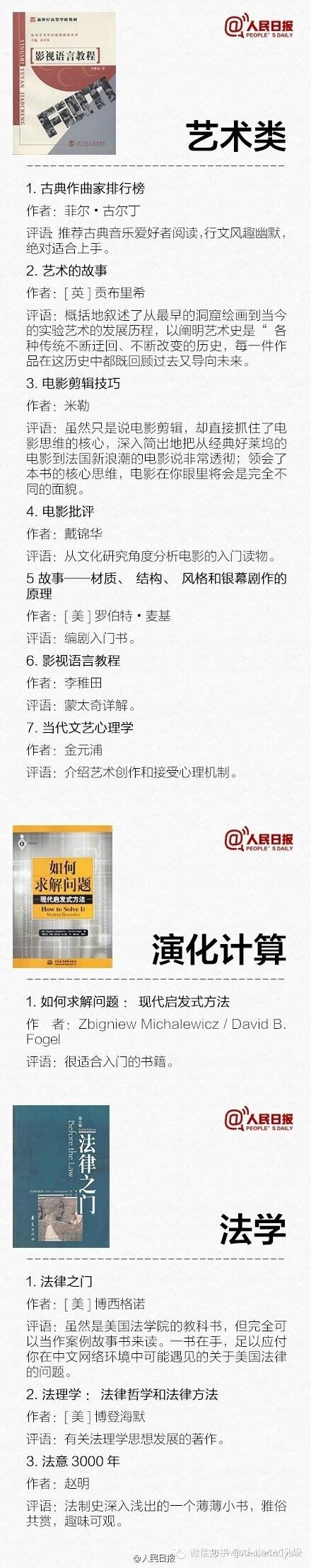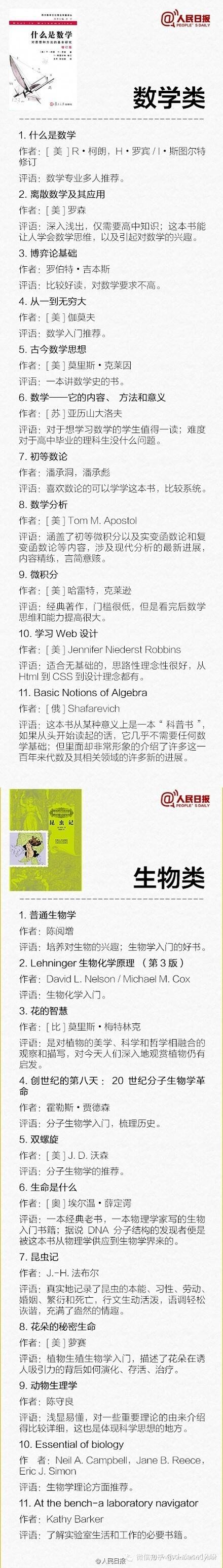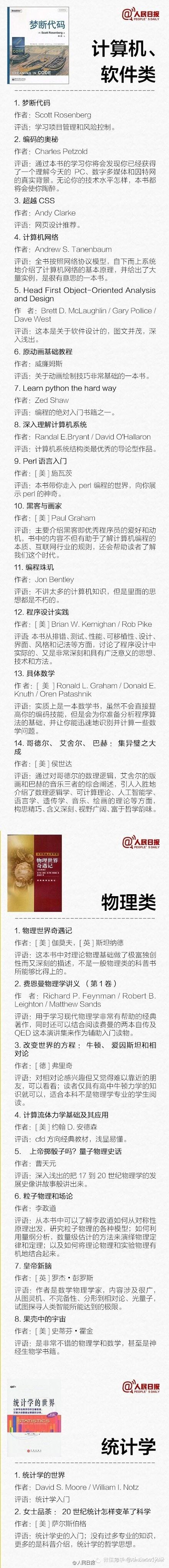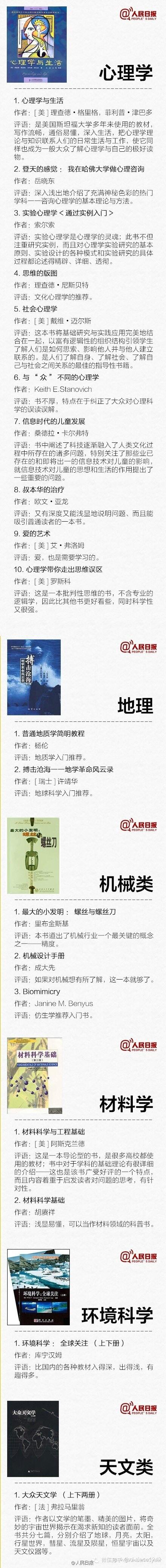 当时的要求是:“先写下你的专业领域,再回答这个问题‘如果一个受过高中教育、但完全不了解你这个领域的人想学习之,你推荐哪本入门书籍?’”。大量网友参与,最后总结了以下这些书。不过,最后列出来的书籍,恐怕不完全是高中水平能掌控的,也难怪,不是所有领域都能轻易入门的。